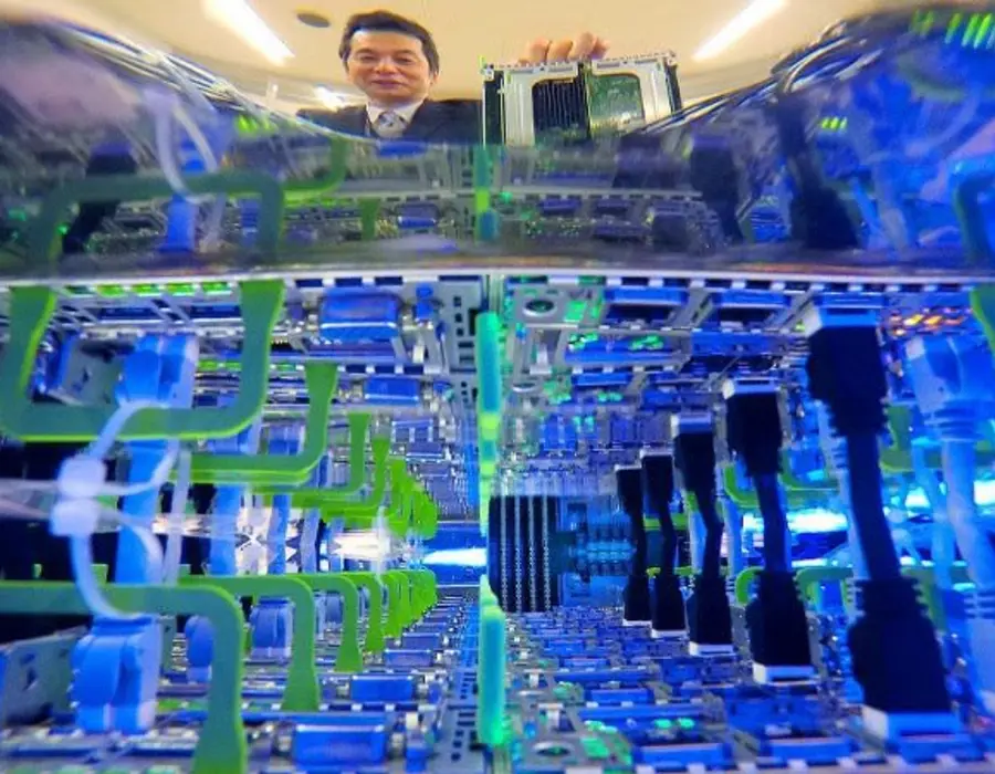 Close-up view of circuit boards and liquid cooling components inside a data center server, showcasing advanced digital infrastructure datacenters