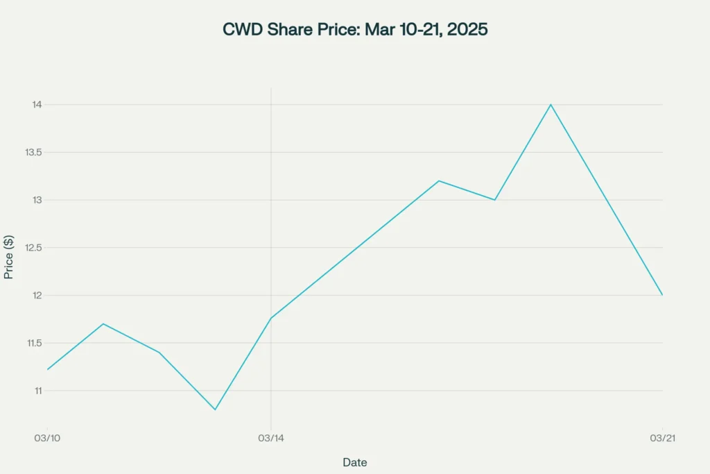 In normal times, micro-caps creep. CWD did the opposite. From March through early September the share price fell roughly 18%, bottoming near $2. But the Chainlink headline catapulted the stock above $48 before gravity kicked in.