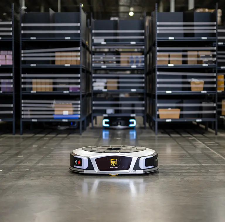 UPS autonomous warehouse robot navigating storage shelves in a modern logistics facility