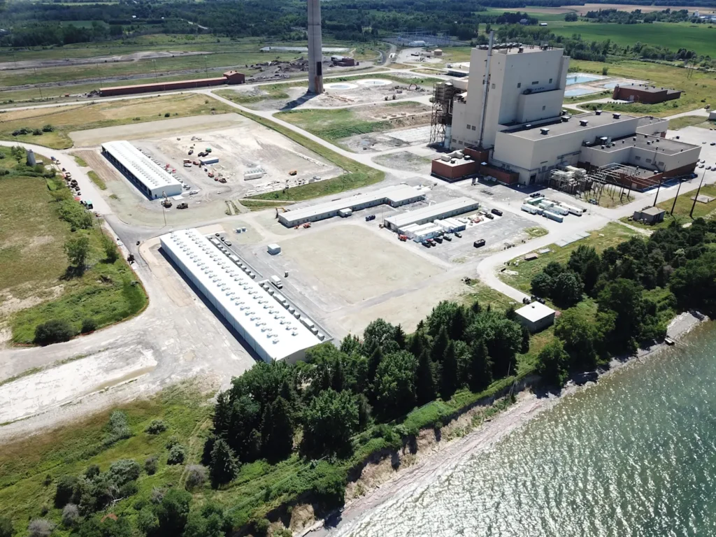 Aerial view of TeraWulf’s Lake Mariner facility in Western New York showing industrial buildings and energy infrastructure by the lakeside